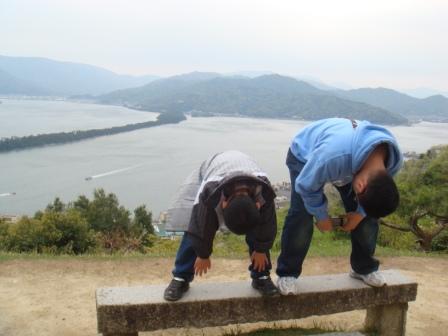 お父さんは、京都の北、与謝郡与謝野町に、この4月から単身赴任。京都市内から暴走族お父さんは車で2時間。母さんだと3時間近くかかります。電車だと、特急で2時間ぐらいでしょうか。ゴールデンウイーク、子どもたちをつれて、入ってきました。お天気はいまいちだったけど、ちょっと車で走れば観光地。楽しんできました。まずは、天橋立。股のぞきのポイントです。